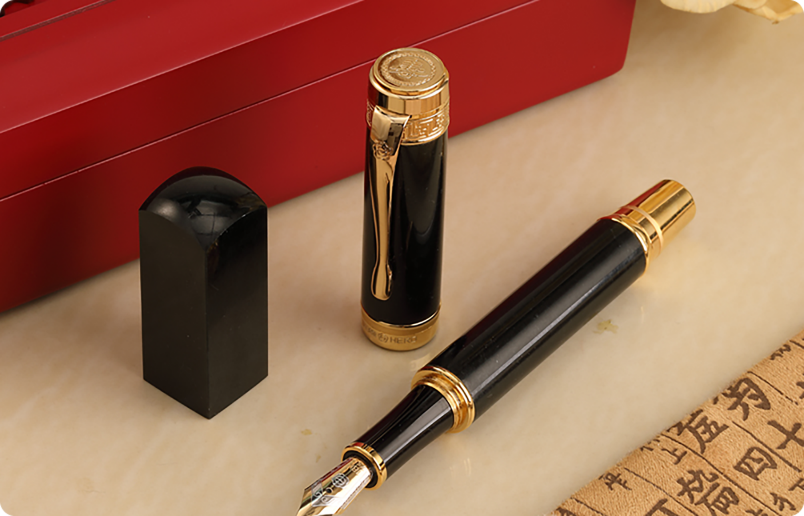 五福临门系列18K金笔——福笔(左二),笔身采用珍贵木材黑檀木,“富贵花开”图案栩栩如生充满浓郁的传统文化和民俗文化色彩。